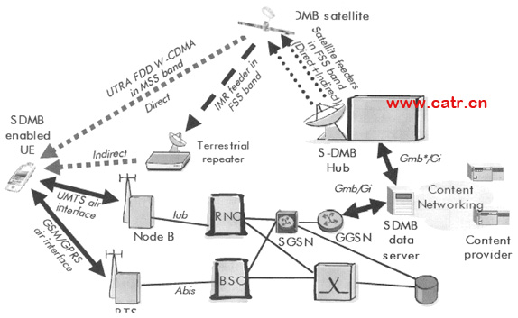 目前,韓國、歐洲力推一種利用手機來接收衛(wèi)星播發(fā)的電視節(jié)目信號的手機電視廣播方式(S-DMB)。S-DMB主要是研究在現(xiàn)有3G移動網(wǎng)絡(luò)上結(jié)合衛(wèi)星以及地面直放站來提供移動廣播、多播業(yè)務(wù),改進3G網(wǎng)絡(luò)的多媒體業(yè)務(wù)提供能力。它將廣播電視網(wǎng)絡(luò)和移動通信網(wǎng)絡(luò)各自的優(yōu)勢互補,下行廣播信道由衛(wèi)星提供,廣播數(shù)據(jù)通過高帶寬的數(shù)字廣播電視網(wǎng)絡(luò)進行電視節(jié)目廣播。上行鏈路采用移動網(wǎng)絡(luò)傳送交互性業(yè)務(wù),移動網(wǎng)絡(luò)提供交互通道,完成業(yè)務(wù)導航,定購及激活,鑒權(quán)計費等功能。具備S-DMB能力的手機終端在連接到GSM或者UMTS網(wǎng)絡(luò)的時候也能同時接收S-DMB信號。