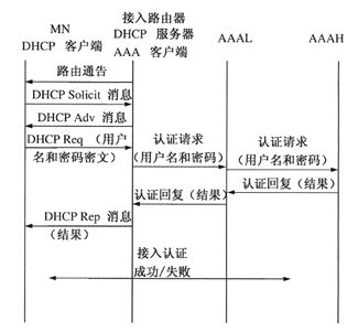 本方案認證機制在比較上述幾種認證機制的優(yōu)缺點的基礎上,根據(jù)層次移動IPv6的網(wǎng)絡特性和運行需求,采用IPv6的動態(tài)主機配置協(xié)議(DHCPv6)結合AAA協(xié)議來完成AAA認證和地址分配過程。該機制工作在網(wǎng)絡層,不依賴鏈路層協(xié)議,有利于移動節(jié)點用多種方式接入網(wǎng)絡,具有兼容性好、利于向高層協(xié)議擴展、實現(xiàn)簡單、容易控制、與移動IP結合性好等優(yōu)點。
