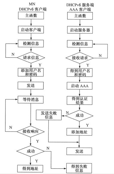 當DHCPv6服務器調(diào)用子進程執(zhí)行AAA客戶端程序后,AAA客戶端將把從MN傳過來的密碼和用戶名添加到認證請求選項中,向AAAL進行認證。AAAL將收到的消息轉發(fā)給AAAH服務器,AAAH收到認證請求后進行認證。如用戶名和密碼正確,則返回Accecpt響應消息,標志認證成功;如用戶名或者密碼錯誤,則返回Reject響應消息,標志認證失敗。AAAL收到認證回復消息后記錄認證信息,下次認證時只需詢問AAAL,減少認證步驟。