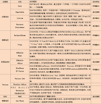 從全球范圍來(lái)看,大多數(shù)重要的固定運(yùn)營(yíng)商、移動(dòng)運(yùn)營(yíng)商和綜合性運(yùn)營(yíng)商都已經(jīng)開(kāi)始或計(jì)劃提供各種形式FMC業(yè)務(wù)(見(jiàn)表)。其中大多數(shù)運(yùn)營(yíng)商提供捆綁業(yè)務(wù)和簡(jiǎn)單的融合業(yè)務(wù),而歐美的一些頂尖運(yùn)營(yíng)商已推出基于融合終端的FMC業(yè)務(wù)。