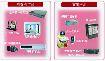 轉(zhuǎn)碼技術(shù)將用來(lái)滿足更廣泛領(lǐng)域的數(shù)字視頻多制式轉(zhuǎn)換需求,不僅應(yīng)用于包括視頻廣播轉(zhuǎn)碼、媒體網(wǎng)管、多會(huì)議單元 、醫(yī)療影響和視頻監(jiān)控等商用產(chǎn)品中,而且也將用于包括數(shù)字媒體適配器、高清視頻會(huì)議終端、高級(jí)數(shù)字機(jī)頂盒、IP視頻電話和高清網(wǎng)絡(luò)攝像機(jī)等消費(fèi)類(lèi)產(chǎn)品。如圖1所示,在商用產(chǎn)品中轉(zhuǎn)碼技術(shù)支持更高密度非常必要,而在消費(fèi)類(lèi)產(chǎn)品中轉(zhuǎn)碼技術(shù)的單片高性價(jià)比則必需。