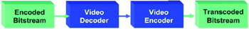 視頻轉(zhuǎn)碼是一個(gè)高運(yùn)算負(fù)荷的過(guò)程,需要對(duì)輸入的視頻流進(jìn)行全解碼、視頻過(guò)濾/圖像處理、并且對(duì)輸出格式進(jìn)行全編碼。最簡(jiǎn)單的轉(zhuǎn)碼過(guò)程(圖3)僅僅涉及到解碼一個(gè)比特流和用不同的編解碼器重新編碼兩個(gè)步驟。這種硬轉(zhuǎn)碼看似很簡(jiǎn)單,只需要一個(gè)解碼器和一個(gè)編碼器,但是最終顯示結(jié)果并不理想,因?yàn)橐曨l數(shù)據(jù)解碼后重新編碼會(huì)降低畫(huà)質(zhì)。