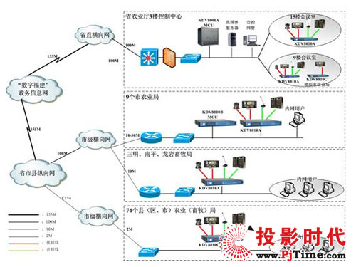 福建省農(nóng)業(yè)廳主管全省農(nóng)業(yè)、畜牧、農(nóng)機(jī)、農(nóng)墾等工作,設(shè)區(qū)市及縣(市、區(qū))設(shè)置農(nóng)業(yè)局主管相應(yīng)工作,其中部分設(shè)區(qū)市、縣農(nóng)業(yè)局和畜牧局分設(shè)。全省農(nóng)業(yè)視頻會(huì)議系統(tǒng)設(shè)計(jì)在省農(nóng)業(yè)廳、設(shè)區(qū)市農(nóng)業(yè)局、畜牧局建設(shè)各自分會(huì)場,非設(shè)區(qū)市所在地的縣(市、區(qū))至少建設(shè)一個(gè)分會(huì)場,使得全省農(nóng)業(yè)系統(tǒng)多部門均能在縣級(jí)或設(shè)區(qū)市所在城鎮(zhèn)同城就近開會(huì)。系統(tǒng)可以在今后進(jìn)行擴(kuò)展建設(shè),使全省縣級(jí)農(nóng)業(yè)、畜牧部門都能夠建設(shè)各自分會(huì)場。
