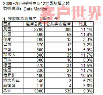 根據(jù)Data Monitor公司近年的分析報(bào)告,12呼叫中心大國(guó)在2008~2009年度共有呼叫中心座席580萬(wàn)個(gè),其中公共事業(yè)類(lèi)呼叫中心座席54萬(wàn)個(gè),占9.3%。