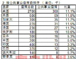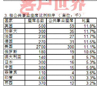 美國(guó)擁有全世界最多的座席,達(dá)到270萬(wàn)個(gè),公共事業(yè)座席30萬(wàn)個(gè),占11.1%;除美國(guó)以外,公共事業(yè)類(lèi)座席總數(shù)排名在第2~6名的依次是:英國(guó),加拿大,德國(guó),法國(guó),俄羅斯。