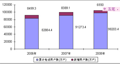 用戶發(fā)展方面,2008年,全國電話用戶新增6930萬戶,總數達到98203.4萬戶。移動電話用戶共計64123萬戶,新增9392.4萬戶,而固定電話出現2483.2萬戶的負增長。移動通信用戶增長仍是拉動我國電信運營市場增長的主要動力。從目前48.5部/百人的普及率來看,我國移動通信用戶發(fā)展仍具備規(guī)模增長空間,并繼續(xù)拉動電信運營市場發(fā)展。