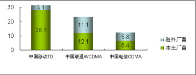 在3G設備市場方面,2008年,中國的WCDMA、CDMA2000與TD-SCDMA三種3G網絡在建設上有不同的進展。中國移動啟動了第二階段的TD-SCDMA網絡建設、中國電信啟動了涉及面向81個重點城市的CDMA全網招標、而中國聯通也開始7個城市建立WCDMA試驗網絡的建設工作。而在所有的網絡建設中,中國本土廠商借3G契機迅速提升競爭力,占據了3G網絡建設大部分市場份額。