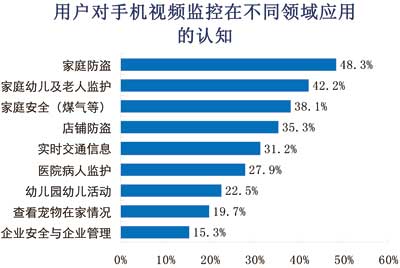 諾達(dá)咨詢調(diào)查數(shù)據(jù)表明,分別有48%、42%和38%的用戶認(rèn)為手機(jī)監(jiān)控可以應(yīng)用于家庭防盜和家庭幼兒及老人監(jiān)管以及家庭安全,其次,有30%-35%的用戶認(rèn)為手機(jī)監(jiān)控可以應(yīng)用于店鋪防盜、交通信息的實(shí)時(shí)發(fā)布。有28%的用戶認(rèn)為手機(jī)監(jiān)控可以應(yīng)用于醫(yī)院病人監(jiān)護(hù)。另外,有不到25%的用戶認(rèn)為,手機(jī)監(jiān)控可以應(yīng)用于孩童在幼兒園活動(dòng)的監(jiān)看、寵物在家情況監(jiān)看和企業(yè)安全與管理。