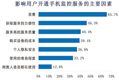 諾達(dá)咨詢進(jìn)一步對(duì)用戶開通手機(jī)監(jiān)控服務(wù)的主要考慮因素進(jìn)行調(diào)查,結(jié)果表明,最重要的因素為資費(fèi),有66%的用戶認(rèn)為資費(fèi)是重要的考慮因素。其次,46%的用戶認(rèn)為獲取服務(wù)的方便性(即業(yè)務(wù)辦理流程)是影響用戶開通手機(jī)監(jiān)控業(yè)務(wù)的重要因素。其他,包括服務(wù)商的質(zhì)量保障、設(shè)備成本、隱私安全和使用難易度對(duì)用戶也有一定的影響,但是影響較小。