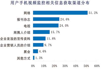 另一方面,運(yùn)營(yíng)商的宣傳不到位。從諾達(dá)咨詢調(diào)查數(shù)據(jù)來(lái)看,用戶目前獲得手機(jī)視頻監(jiān)控相關(guān)信息的主要渠道是互聯(lián)網(wǎng),有51%的用戶是通過(guò)互聯(lián)網(wǎng)了解手機(jī)視頻監(jiān)控的,而從傳統(tǒng)的電視媒體和報(bào)刊雜志獲得相關(guān)信息的用戶僅僅約各占24%,通過(guò)相關(guān)手機(jī)視頻監(jiān)控企業(yè)發(fā)放宣傳資料和介紹獲取相關(guān)信息的用戶各占12%和10%。由此可見,手機(jī)視頻監(jiān)控的宣傳尚不到位,導(dǎo)致消費(fèi)者不能通過(guò)多方渠道獲取相關(guān)信息。