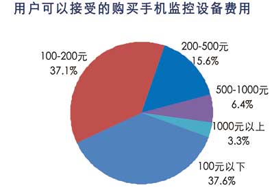 諾達(dá)咨詢調(diào)查數(shù)據(jù)表明,可以接受的購(gòu)買手機(jī)監(jiān)控設(shè)備的費(fèi)用在100元以下的用戶占38%,有同樣比例的用戶對(duì)100-200元的設(shè)備費(fèi)用也可以接受,16%的用戶對(duì)200-500元的設(shè)備費(fèi)用可以接受。