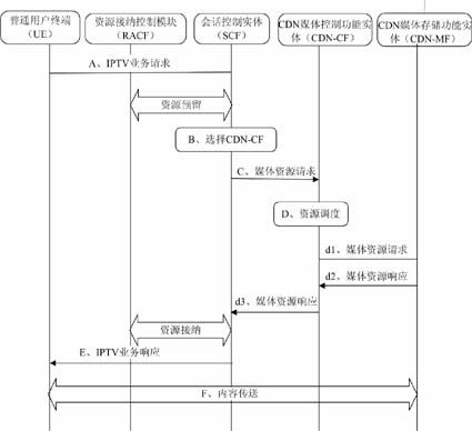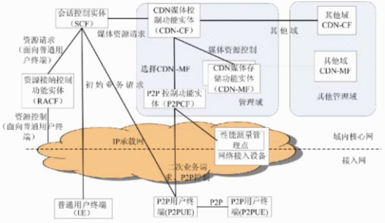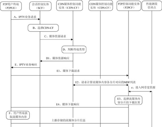 本架構(gòu)的最大特點是結(jié)合CDN和NGN架構(gòu)(注:為了簡化沒有給出詳細的NGN相關(guān)控制實體,架構(gòu)中只體現(xiàn)了會話控制實體和資源接納控制功能實體),在此基礎上引入P2P相關(guān)功能,包括P2P控制實體和P2P用戶終端。通過對基于NGN的IPTV架構(gòu)和CDN架構(gòu)的改進,使該架構(gòu)既能夠具備電信網(wǎng)中網(wǎng)絡資源可控、可管的特征,又通過引入P2P具備了一定的靈活性和自組織能力,將電信網(wǎng)和互聯(lián)網(wǎng)技術(shù)的優(yōu)勢均集中在了一起。