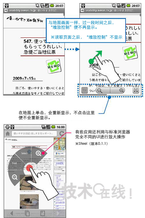 圖片說明: 利用不同操作調(diào)出同一工具為在Android的標準瀏覽器(上面的兩個畫面)上調(diào)出縮放畫面顯示的工具(縮放控制),用手指拖拽畫面(向一個方面滑動)。為利用地圖應用軟件調(diào)出同一工具,需要輕敲畫面(敲擊)能從在Android市場上下載的瀏覽器(下面的畫面)有能夠利用完全不同的UI縮放畫面的工具。