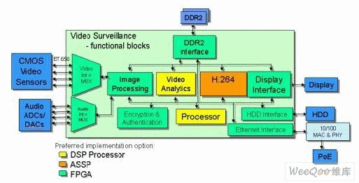 經(jīng)過壓縮后的數(shù)據(jù)通過硬盤驅(qū)動器接口存儲至視頻存儲服務(wù)器,或通過以太網(wǎng)網(wǎng)絡(luò)發(fā)送。視頻數(shù)據(jù)傳送到顯示器之前通常是取自硬盤驅(qū)動器,并經(jīng)過了解碼以及一些圖像后處理,如縮放、色彩空間轉(zhuǎn)換或覆蓋應(yīng)用。通常情況下,存儲器接口(如DDR2)是用來存儲視頻幀。此外,某些系統(tǒng)要求視頻內(nèi)容的實(shí)時加密以確保安全和源/用戶身份驗(yàn)證。最后,需要用處理器控制和協(xié)調(diào)/排定各種不同的任務(wù)。