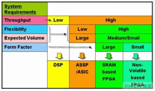 但是ASIC和ASSP帶來了高昂的非重復(fù)性工程費(fèi)用成本,除非批量非常大。如果只有一小部分用戶使用特殊的功能模塊,那么FPGA解決方案可提供更好的回報。對于ASIC和ASSP,這些器件有限的功能和固有的不靈活性,不允許在設(shè)計(jì)完成后根據(jù)市場的要求改進(jìn)或添加新的功能。FPGA卻能提供廣泛的功能和高度的靈活性。