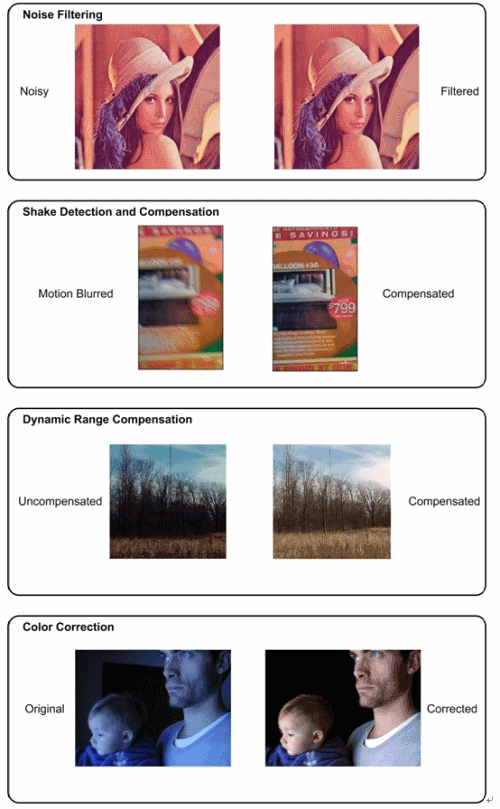 圖: 四種預處理算法示例:噪聲濾波、抖動檢測與補償、動態(tài)范圍補償和顏色校正。
