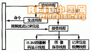 在軟件設(shè)計(jì)方面包括兩部分,一部分是監(jiān)控終端的監(jiān)控軟件,另一部分是各便件的底層軟件。監(jiān)控終端采用了多線程的軟件設(shè)計(jì)方法,系統(tǒng)對連接的每一個(gè)監(jiān)控點(diǎn)共采用了6個(gè)線程,即網(wǎng)絡(luò)監(jiān)聽線程、發(fā)送線程、接受線程、H.26 3圖像解碼顯示線程、圖像保存線程和記錄信息(門口終端的撥號、門禁一卡通等記錄信息)檢測線程,如圖4所示。