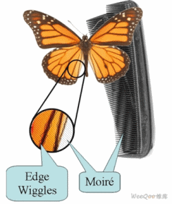 為了反映鏡像邊帶沒有衰減的效果,圖3b和3c示意了奈奎斯特頻率和時(shí)鐘頻率處的頻譜重疊。這些疊加的鏡像邊帶信號(hào)(圖3d)與視頻信號(hào)相比具有隨機(jī)的相位差。圖4表示我們需要避免的圖像誤差!斑吘墧[動(dòng)”是高頻邊緣干擾,它重疊在視頻信號(hào)上,具有隨機(jī)變化的相位。摩爾效應(yīng)是時(shí)鐘、視頻信號(hào)頻率之間相互作用的結(jié)果。