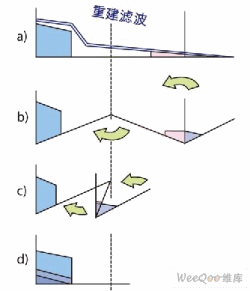 從圖5可以看出重建濾波器的作用,利用參考書中提供的定理可以很容易理解頻譜混疊。通常,在頻域,頻率和放大倍數(shù)都采用對(duì)數(shù)刻度,重建濾波器的頻響特性表現(xiàn)為平滑曲線。然而,為了說明邊帶重疊的位置,我們用線性坐標(biāo)表示頻率和放大倍數(shù)。為了表示低通濾波器在同樣刻度坐標(biāo)下的衰減特性,從濾波器頻響曲線可以看出:對(duì)于有用的視頻信號(hào)衰減很少,對(duì)于鏡像頻率衰減較大。圖5b和5c顯示了混疊效應(yīng),但是應(yīng)該注意到,與圖3d相比,圖5d中的鏡像頻率被顯著衰減。