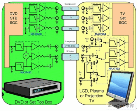 圖6左側(cè)是機(jī)頂盒或DVD機(jī)的框圖,片上系統(tǒng)(SOC)包含了DAC,輸出經(jīng)過低通濾波器(例如MAX7443)進(jìn)行視頻重建。濾波器芯片還包含75Ω同軸電纜驅(qū)動(dòng)器,驅(qū)動(dòng)信號(hào)在電纜上的傳輸。圖6右側(cè)用于信號(hào)接收,信號(hào)在經(jīng)過抗混疊濾波器后送入電視機(jī)SOC的ADC。