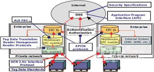 EPCglobal提出了Auto-ID系統(tǒng)的五大技術(shù)組成,分別是EPC(電子產(chǎn)品碼)標(biāo)簽、RFID標(biāo)簽閱讀器、ALE中間件實(shí)現(xiàn)信息的過(guò)濾和采集、EPCIS信息服務(wù)系統(tǒng),以及信息發(fā)現(xiàn)服務(wù)(包括ONS和PML)。由于從一開始就讓世界各大洲的從業(yè)人員充分參與,EPCGlobal標(biāo)準(zhǔn)(架構(gòu)圖如下)得到了較廣泛認(rèn)同,這里不再對(duì)其標(biāo)準(zhǔn)體系架構(gòu)贅述。