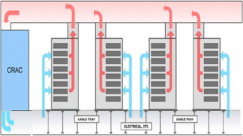 追求更低前期成本和更高運(yùn)行效率的公司可以安裝被動(dòng)式冷卻系統(tǒng)。它們的機(jī)殼上裝有一個(gè)氣密的后門和煙囪,用于收集來(lái)自服務(wù)氣的熱排風(fēng),并將其直接引導(dǎo)至CRAC裝置上的回風(fēng)管道中。然后,CRAC裝置對(duì)排風(fēng)進(jìn)行冷卻并重新循環(huán)。被動(dòng)式系統(tǒng)要求機(jī)柜從前到后都具有較強(qiáng)的氣密性,以便與由CRAC裝置進(jìn)入的冷風(fēng)混合的服務(wù)器熱風(fēng)盡量少。通過(guò)比普通的熱-冷通道技術(shù)更徹底地分離冷風(fēng)和熱風(fēng),設(shè)計(jì)合理的被動(dòng)式冷卻系統(tǒng)甚至能以低成本使灼熱的30kW服務(wù)器機(jī)柜在安全溫度下運(yùn)行。