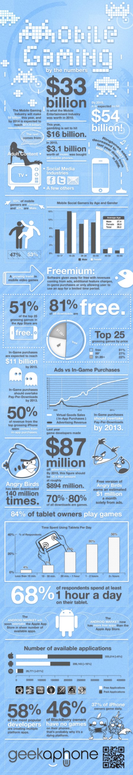 隨著移動互聯(lián)網(wǎng)浪潮的興起,大家玩游戲的平臺逐漸從傳統(tǒng)的游戲機(jī),PC,TV向新興的智能手機(jī)和平板電腦等移動終端遷移。PC時代的游戲巨頭EA,育碧等公司的光芒不再,PopCap,Rovio和Zynga等新興游戲公司出品的游戲則吸引著越來越多的玩家。照目前強(qiáng)勁的發(fā)展趨勢來看,移動游戲在未來將取得像PC游戲現(xiàn)在的地位,成為游戲市場的主力。關(guān)注移動終端發(fā)展的博客Geekaphone制作了下面這張超大信息圖,用詳細(xì)的統(tǒng)計數(shù)字展示了移動游戲發(fā)展的強(qiáng)勁趨勢。