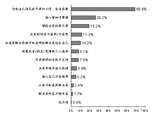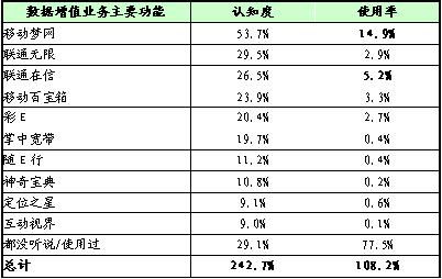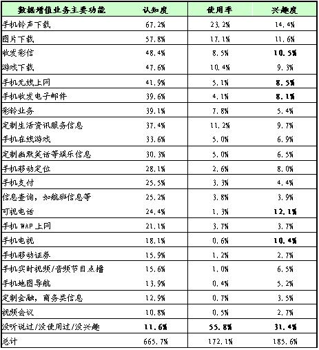 在短信業(yè)務(wù)狂飆突進(jìn)的帶動(dòng)下,數(shù)據(jù)增值業(yè)務(wù)以其獨(dú)特的魅力迅速擴(kuò)大著市場(chǎng)。根據(jù)零點(diǎn)調(diào)查與零點(diǎn)指標(biāo)數(shù)據(jù)網(wǎng)近期合作的調(diào)查結(jié)果,有近七成的(68.1%)手機(jī)用戶已使用過數(shù)據(jù)增值業(yè)務(wù),但數(shù)據(jù)增值業(yè)務(wù)的使用還主要集中在短信業(yè)務(wù)上。數(shù)據(jù)增值業(yè)務(wù)的主力用戶群體特征體現(xiàn)為高學(xué)歷和年輕化。對(duì)數(shù)據(jù)增值業(yè)務(wù)品牌認(rèn)知度較高的是移動(dòng)夢(mèng)網(wǎng)、聯(lián)通無限和聯(lián)通在信等,對(duì)數(shù)據(jù)增值業(yè)務(wù)主要功能的認(rèn)知度較高的是手機(jī)鈴聲下載、圖片下載等,但無論是對(duì)業(yè)務(wù)品牌還是對(duì)主要功能的使用率均很低。就感興趣的程度來看,可視電話、手機(jī)電視、收發(fā)彩信等是目前用戶提及較多的其它數(shù)據(jù)增值業(yè)務(wù)。調(diào)查還發(fā)現(xiàn),制約手機(jī)用戶使用更多數(shù)據(jù)增值業(yè)務(wù)的原因主要是實(shí)際需求不足、資費(fèi)太貴、宣傳推廣不到位、終端設(shè)備不支持等。