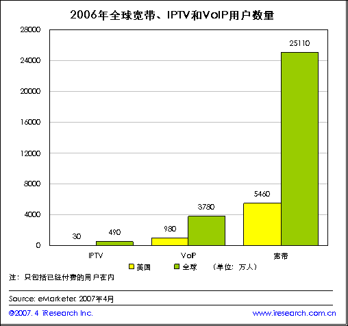 iResearch艾瑞市場咨詢根據(jù)eMarketer最新的數(shù)據(jù)發(fā)現(xiàn),寬帶上網(wǎng)環(huán)境為一些列的寬帶平臺應用產(chǎn)品創(chuàng)造了良好的使用環(huán)境,各種服務同步發(fā)展起來。隨著全球?qū)拵в脩魯?shù)量的逐漸增加,全球IPTV和VoIP用戶也迅速成長。到2006年全球?qū)拵в脩暨_到2.511億人,VoIP和IPTV的全球用戶數(shù)量也分別達到了3780萬人和490萬人。