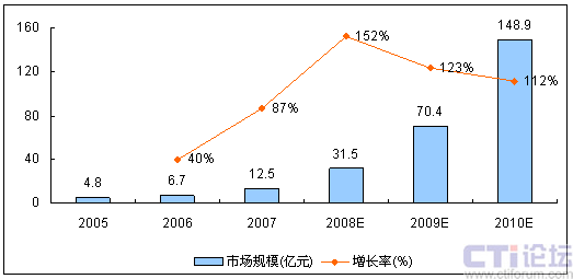 馳昂咨詢(Sinotes)發(fā)布的《2007-2008年中國移動(dòng)增值業(yè)務(wù)市場研究年度報(bào)告》顯示,截止至2007年底,中國移動(dòng)即時(shí)通信(IM)市場規(guī)模已經(jīng)達(dá)到12.5億元。而隨著3G時(shí)代的來臨,在電信運(yùn)營商的積極推動(dòng)下,國內(nèi)移動(dòng)IM市場必將步入快速增長期,預(yù)計(jì)未來三年增長率都將在100%以上。