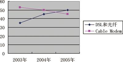 從近幾年美國(guó)寬帶接入市場(chǎng)發(fā)展的軌跡上,也可以很清楚地看出兩者的增長(zhǎng)情況。FCC公布的數(shù)據(jù)(如圖所示)顯示,在寬帶接入方面,2002年底美國(guó)寬帶用戶中CableModem為1130.7萬(wàn)戶,占總數(shù)52.7%;DSL為644.44萬(wàn)戶,占總數(shù)的32.6%;光纖為55.35萬(wàn)戶,占總數(shù)的2.8%;衛(wèi)星與其他為146.28萬(wàn)戶,占總數(shù)的7.4%?梢姡珻ableModem市場(chǎng)份額占的最大;但到了2004年初,DSL及光纖的市場(chǎng)份額迅速攀升到45%以上;2005年,全美寬帶用戶總數(shù)達(dá)到4290萬(wàn)戶,DSL新增超過520萬(wàn)戶,CableModem新增440萬(wàn)戶,這一年DSL用戶首次使增長(zhǎng)數(shù)量超過了Cable Modem用戶數(shù),這是個(gè)歷史性的突破,至此以后,有線電視公司處處被動(dòng)。