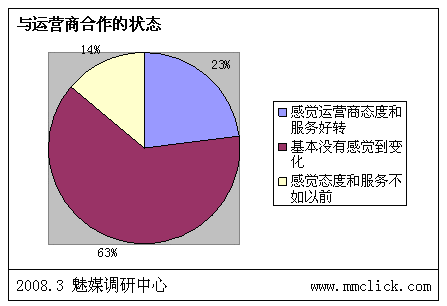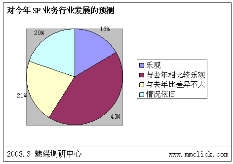 最近公布的空中網(wǎng)財務(wù)報表的數(shù)據(jù)顯示空中網(wǎng)總收入環(huán)比增長,結(jié)合之前廣東移動推出:廣東移動向重服務(wù)轉(zhuǎn)變 首推“6+1”服務(wù),SP行業(yè)可以說是暖風(fēng)頻吹。魅媒無線行業(yè)調(diào)研中心隨機(jī)從3月3日到3月5日隨記電話采訪50多家全網(wǎng)以及廣東省網(wǎng)SP公司相關(guān)負(fù)責(zé)人,對最近的SP行業(yè)的政策調(diào)整進(jìn)行調(diào)查,有以下的數(shù)據(jù):