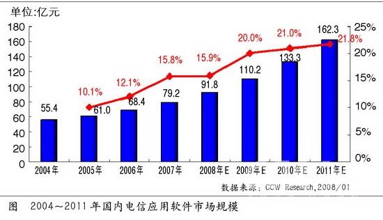 3G是中國(guó)未來(lái)通信建設(shè)的重點(diǎn)。隨著3G發(fā)展趨勢(shì)逐漸明朗化,為了有效地對(duì)3G網(wǎng)絡(luò)進(jìn)行支撐和管理,針對(duì)3G業(yè)務(wù)的IT系統(tǒng)建設(shè)也逐漸成為運(yùn)營(yíng)商信息化的重點(diǎn)建設(shè)項(xiàng)目。BSS、OSS和MSS將成為這次建設(shè)的主要方向,今后相當(dāng)長(zhǎng)的一段時(shí)間內(nèi),計(jì)費(fèi)賬務(wù)系統(tǒng)、經(jīng)營(yíng)分析與決策系統(tǒng)、網(wǎng)絡(luò)資源管理系統(tǒng)、客戶關(guān)系管理系統(tǒng)等將成為國(guó)內(nèi)電信運(yùn)營(yíng)商建設(shè)或規(guī)劃的重點(diǎn)。根據(jù)計(jì)世資訊調(diào)查顯示,2007~2011年,在3G建設(shè)全面展開后,電信應(yīng)用軟件市場(chǎng)的市場(chǎng)規(guī)模累積將達(dá)到將近500億元的市場(chǎng)份額。