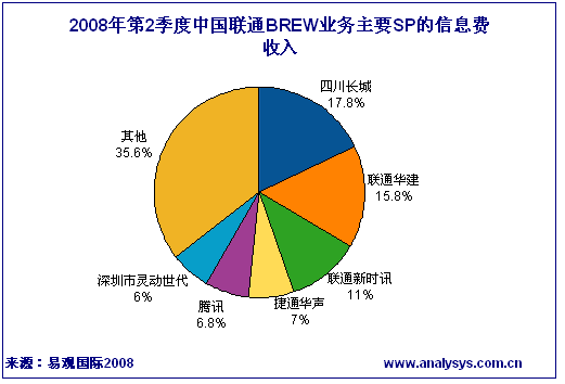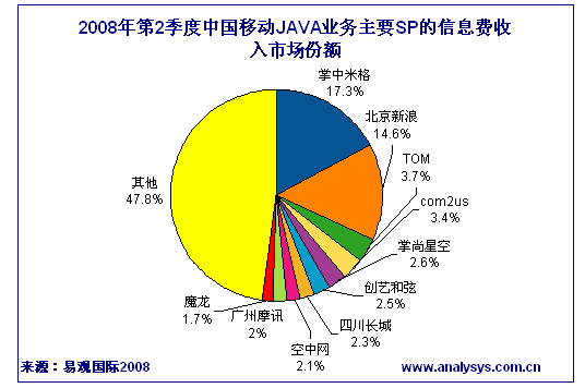 易觀國際近期發(fā)布《2008年第2季度中國手機(jī)游戲市場季度監(jiān)測》顯示:中國移動JAVA業(yè)務(wù)SP信息費方面,掌中米格、北京新浪分居前兩名,兩者市場占有率已提高至31.9%。其中掌中米格信息費季度收入達(dá)到2505.86萬元,市場占比為17.3%,而新浪信息費收入市場占比為14.6%。信息費收入的第3至第5名依次為TOM、com2us、掌尚星空,三者總市場占比為9.7%。