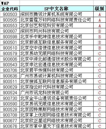 從榜單上可以看到,在短信業(yè)務(wù)上,北京星潮在線文化發(fā)展有限公司、北京雷霆萬(wàn)鈞網(wǎng)絡(luò)科技有限責(zé)任公司和南京網(wǎng)典科技有限公司獲A評(píng)級(jí)。深圳市騰訊計(jì)算機(jī)系統(tǒng)有限公司、北京雷霆萬(wàn)鈞網(wǎng)絡(luò)科技有限責(zé)任公司和北京創(chuàng)藝和弦科貿(mào)有限公司獲得WAP業(yè)務(wù)的A評(píng)級(jí)。