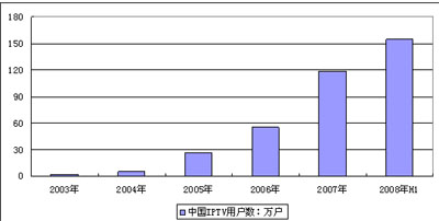2008年7月,中國(guó)最大的ICT咨詢(xún)研究機(jī)構(gòu)—賽迪顧問(wèn)股份有限公司(CCID Consulting,股票代碼:HK8235)發(fā)布的數(shù)據(jù)顯示:2008年上半年中國(guó)IPTV用戶(hù)數(shù)已達(dá)到154.5萬(wàn),尤其是中國(guó)電信方面,隨著推廣力度的不斷增加,用戶(hù)數(shù)量增長(zhǎng)迅猛。
