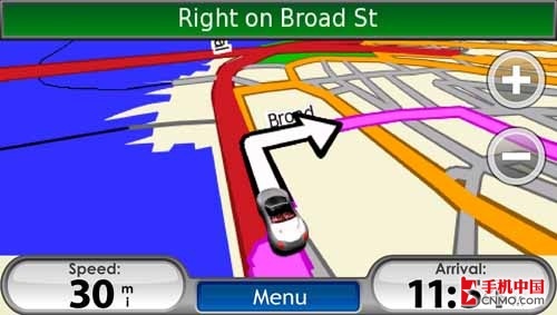 色彩豐富的界面、臨場感十足的導航界面,是Garmin Nuvifon帶給用戶的全新導航體驗。用超酷的跑車來表現(xiàn)目前用戶所處的方位,極具創(chuàng)意之余也更加直觀;用戶也可通過觸摸虛擬按鍵來實現(xiàn)地圖的放大縮小。