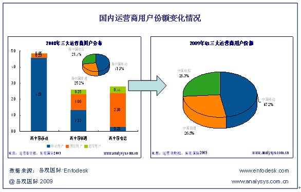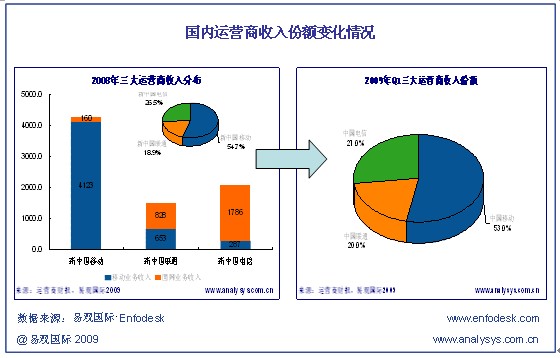 易觀國(guó)際(Analysys International)認(rèn)為,隨著三大3G建設(shè)的逐漸完善與全面發(fā)力各項(xiàng)業(yè)務(wù)創(chuàng)新和營(yíng)銷推廣,重組造成的影響將變得更加全面和深入。