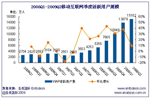 2009年第2季度中國移動互聯(lián)網活躍用戶規(guī)模達1.52億
