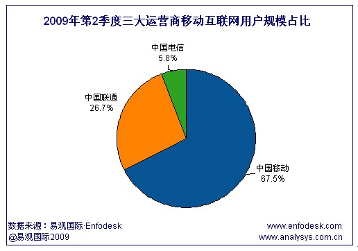 易觀國際(Analysys International)研究發(fā)現(xiàn),相比2009年第1季度,中國聯(lián)通、中國電信的移動互聯(lián)網用戶規(guī)模占比都有小幅增長。尤其是中國電信,在2009年5月17日正式推出WAP業(yè)務并輔以豐富應用,在某種程度上加速了中國電信移動互聯(lián)網用戶規(guī)模的小幅攀升。