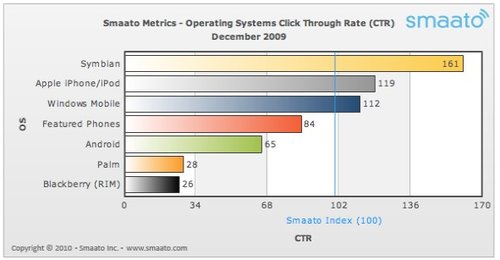 Smaato的數據顯示,將所有手機平臺的移動廣告平均點擊率設為100分,那么Symbian的得分高達161分,排名第一,遙遙領先于得分119、排名第二的iPhone,而Android得分僅65。比Android更差的是Palm和黑莓手機。