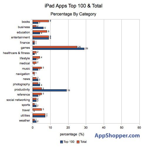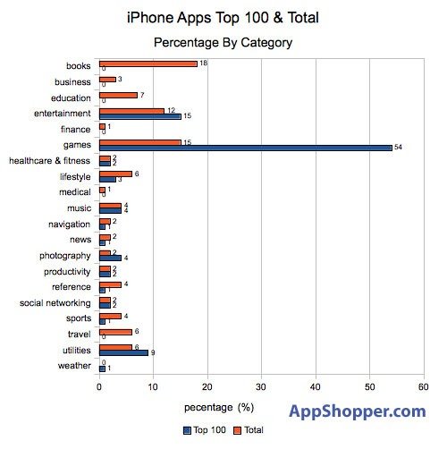 “生產力”軟件雖然只占軟件總數(shù)的5%,但在Top100排行榜中卻占據(jù)了19%;“游戲”仍然居第一位,無論是在軟件總數(shù)比例(25%)還是在Top100排行榜中的比例(29%),但兩者的比率相對均衡。