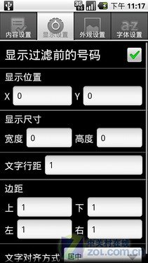 針對Android大屏觸摸手機的特性,此版來電通也來/去電樣式中添加了許多個性化元素,用戶可以根據(jù)自己的需求來設(shè)定來電號碼在屏幕中顯示的位置,通過X、Y坐標(biāo)來設(shè)定,而且還可以設(shè)定來電的背景圖片,相對于Symbian S6O平臺上的個性化設(shè)置來說,此版本要更豐富。