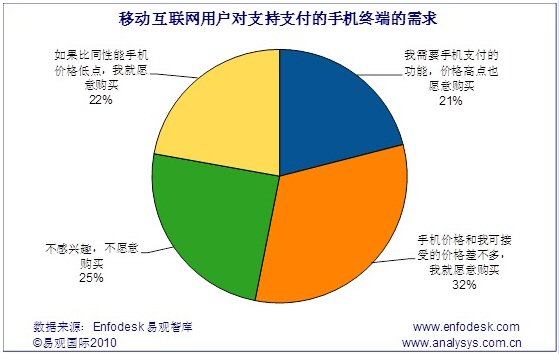 據(jù)Enfodesk易觀智庫最新報(bào)告《中國移動(dòng)互聯(lián)網(wǎng)市場(chǎng)用戶研究報(bào)告2010》研究發(fā)現(xiàn),目前在移動(dòng)互聯(lián)網(wǎng)用戶中,有75%的用戶對(duì)具有移動(dòng)支付功能的手機(jī)表現(xiàn)出明顯的興趣,其中影響不大,完全靠性價(jià)比決定是否購買的用戶占比最多,約為32%,只有在移動(dòng)具備支付功能的手機(jī)和可接受價(jià)格相近時(shí)才會(huì)購買。另外21%的人由于對(duì)移動(dòng)支付業(yè)務(wù)需求程度較高,愿意為此付出更高價(jià)格,其他22%的用戶則在比同性能手機(jī)價(jià)格低些之后,才會(huì)進(jìn)行消費(fèi)。除此之外,還有25%的用戶對(duì)于具備支付功能的手機(jī)沒有絲毫興趣,不愿意購買。