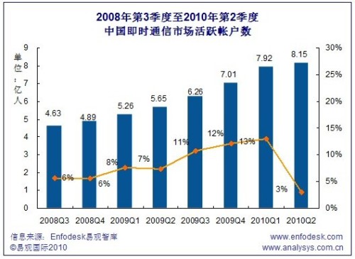 2010Q2中國(guó)即時(shí)通信市場(chǎng)活躍帳戶(hù)數(shù)超過(guò)8億
