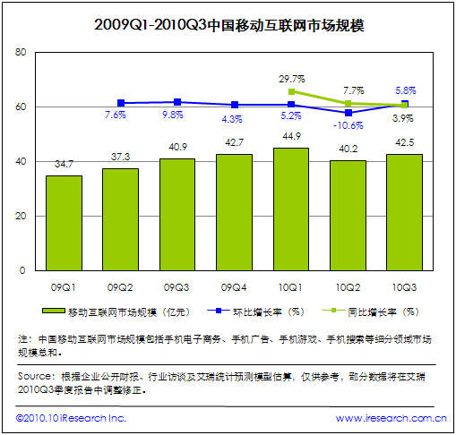 艾瑞:2010Q3中國(guó)移動(dòng)互聯(lián)網(wǎng)市場(chǎng)規(guī)模小幅增長(zhǎng)