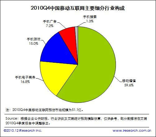 根據(jù)艾瑞咨詢即將發(fā)布的2010年第四季度中國移動互聯(lián)網(wǎng)市場監(jiān)測數(shù)據(jù)顯示,2010Q4中國移動互聯(lián)網(wǎng)市場整體規(guī)模達(dá)到51.1億,同比增長19.8%,環(huán)比增長20.3%。艾瑞咨詢分析認(rèn)為,本季度電信運(yùn)營商對計(jì)費(fèi)通道治理開始收尾,移動增值市場整體復(fù)蘇。同時(shí)手機(jī)電子商務(wù)、手機(jī)游戲業(yè)務(wù)領(lǐng)域取得良好市場表現(xiàn),受手機(jī)應(yīng)用商店、位置簽到服務(wù)等新型手機(jī)業(yè)務(wù)創(chuàng)新的帶動,移動互聯(lián)網(wǎng)規(guī)?傮w攀升,投融資比重增加。