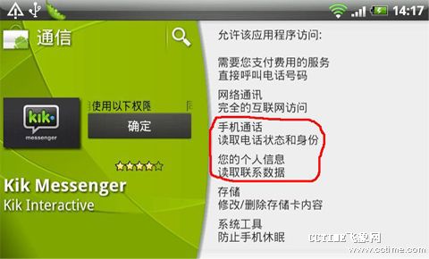 目前,很多手機社交應(yīng)用中加入了對用戶關(guān)系的抓取,這些應(yīng)用在用戶需要尋求社交關(guān)系時,將讀取用戶通訊錄中的信息,并進行自動匹配。其中包括手機廠商HTC的HTCSENSE,UCWEB中的UC樂園,以及最近火熱的kik類應(yīng)用,如KikMessenger,米聊、微信等。多數(shù)用戶表示對于此種抓取通訊錄的行為表示疑慮。