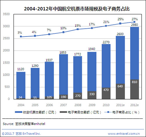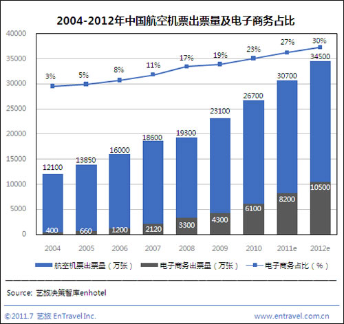 出票量方面,2011年上半年中國航空市場通過電子商務(wù)渠道的出票量約3900萬張,航空市場出票量為1.4億張,電子商務(wù)渠道占整體出票量的28%。隨著第三季度航空市場進(jìn)入旺季,需求將帶動出票量強(qiáng)勢上升。藝旅咨詢預(yù)測2011年中國航空機(jī)票電子商務(wù)出票量將達(dá)8200萬張。