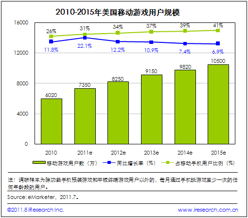 iResearch艾瑞咨詢根據(jù)eMarketer最新發(fā)布數(shù)據(jù)發(fā)現(xiàn),2010年美國移動游戲用戶規(guī)模為6020萬人,同比增長11.8%,占美國移動手機用戶比例為26%;預(yù)計未來五年內(nèi),用戶規(guī)模將保持持續(xù)增長勢態(tài),2011年將出現(xiàn)一個較高的增長點,移動游戲用戶數(shù)將達到7350萬人,同比增長22.1%,在移動手機用戶中的滲透率達31%;之后增長將逐漸趨緩,到2015年用戶規(guī)模將突破一億,達到1.05億,同比增長率降為6.9%,滲透率達41%。